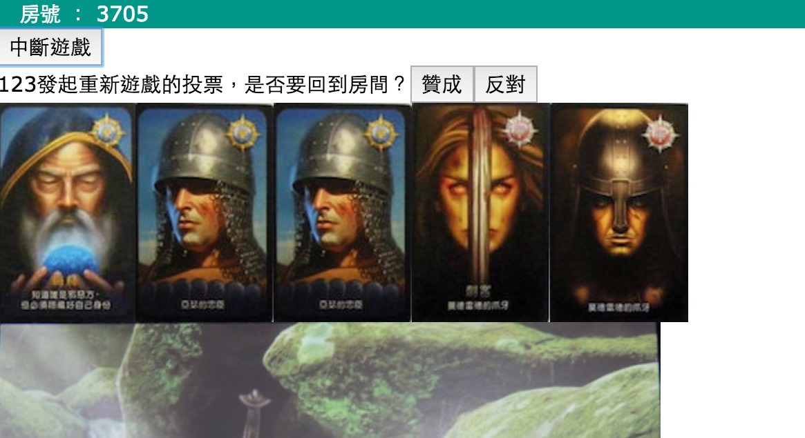 若是玩家中途斷線,可等待他回覆遊戲,或者任意一位玩家可在此處提出中斷遊戲要求,當過半數玩家同意則會回到房間