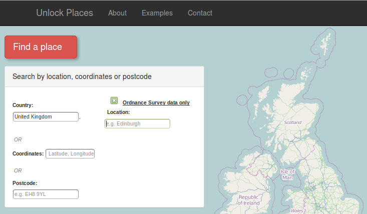 If the user selects "United Kingdom" in the country text box, an option to retrieve data only from ordnance survey appears (fig. right).