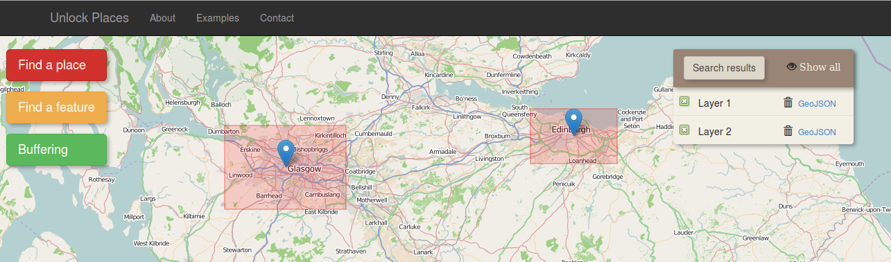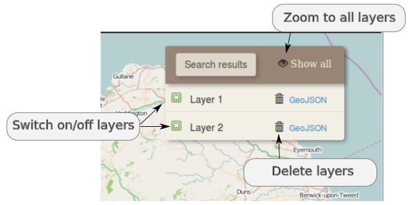 4. The results can be manipulated on the "search result" panel, on the right side of the map. Each layer can be switched on/off by clicking on the check box on the left of the layer name or can be deleted by clicking the rubbish bin icon. The "Show all" icon on the search result panel sets the zoom extent of the map so as all the layers to be visible