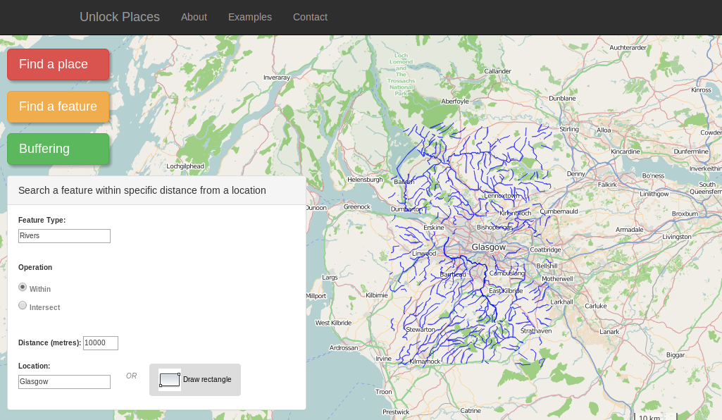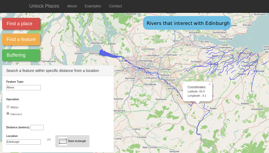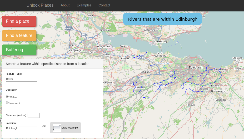 Click the green button on the left side of the page. Search in the first autocomplete box the feature type of your preference. Then select one of the operations "within" or "intersect". These operations indicate if the user wants the selected features to intersect with the boundaries of a region (fig. bottom-left) or if the features will be within this region (fig. bottom-right). After that, we select the distance (in metres) within which the features are going to be displayed (fig. top). Finally, there is the option to search a location using the textbox or to draw a region on the map.