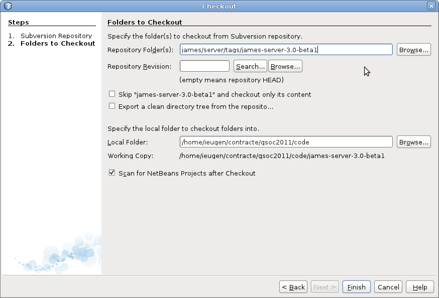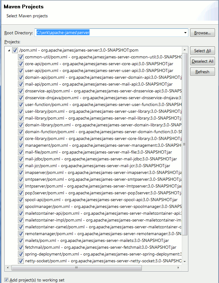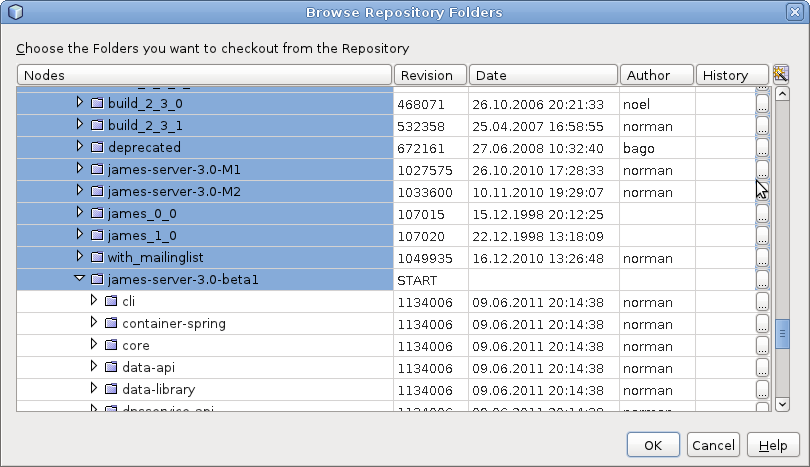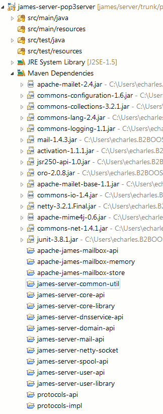 the whole subversion repository. I wanted to build James 3.0beta so I choosed james-serve-3.0-beta1 under james/server/tags/ folder.