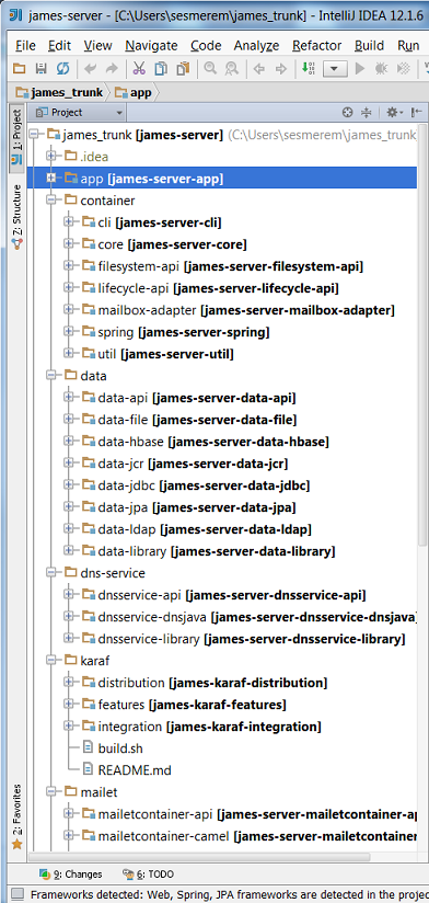 This section has been created using IntelliJ IDEA 12 and Maven 3. And downloading the trunk version of the server from http://git-wip-us.apache.org/repos/asf/james-project.git/.