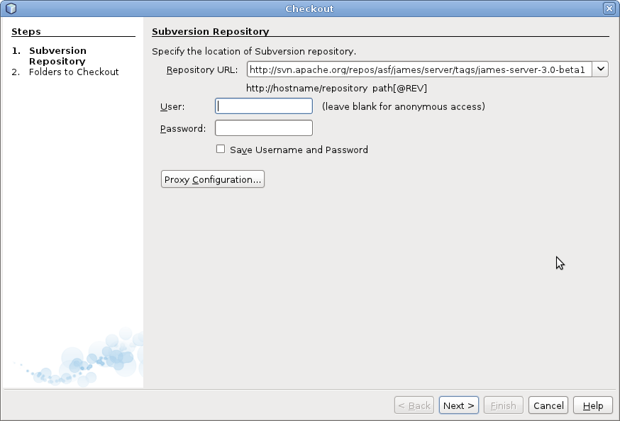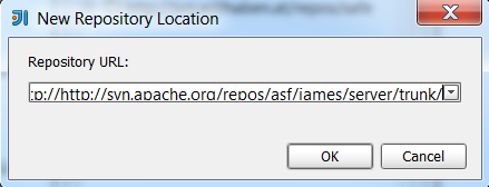 You will see an dialog window used to enter the information about the Subversion repository you are going to use. It looks like this: