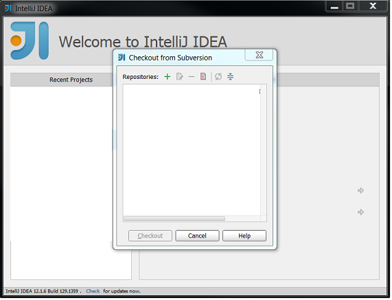 First, in the Welcome page, click on Check out from Version Control and select Subversion.