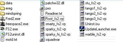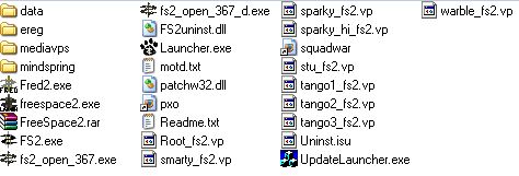 Whatever you do don't delete the original FreeSpace VPs. Quite often people assume that they are no longer needed and delete them only to find the game doesn't run as a result. Getting hold of the cutscenesDue to unfortunate licensing agreements the code for playing the .mve movies that retail uses was ripped out of the source code before it was given to the community. You'll have to get hold of replacements (usually in .avi format). Information on how to do that is given in my Cutscenes section.Once you have them the cutscenes go anywhere that FS2 can find them. This can be in your main folder, Data, Data\Movies, or even the mediavps folder you created earlier. Freespace2\Data is probably a good choice. Running the launcherAt this point your Freespace2 folder should look something like this (The build you're using will probably be different though).![]()
