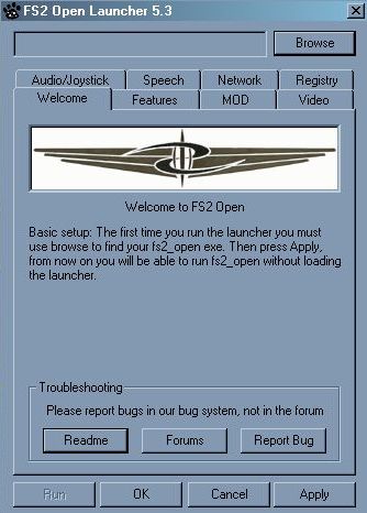 Basic setupFirst thing to do is to click on the "Browse..." button at the top of the Launcher and select the build you installed.Next, ensure that the "Audio/Joystick" and "Network" tabs have the proper settings. (If you have trouble with your joystick not working properly in FS2_Open, you may try the "Force 0" or "Force 1" options, which will force FS2_Open to use the first or second joysticks, respectively. Speech setupIf you are using Windows XP, or have the Speech API installed, FS2_Open will be able to read briefings, techroom descriptions, and even in game messages to you using computer-generated voices. Although no match for real voice acting, it is convenient when valid plot points are mentioned in the middle of combat. Speech in the various locations can be turned on and off by checking and unchecking the check boxes; you can choose which of the installed voices to use in FS2_Open by changing the drop-down menu.Video setupOn the "Video" tab, you can choose which API to use (OpenGL or Direct3D), what resolution to run in, and whether to use anti-aliasing (Multisampling) or not."Allow non standard modes" will let you choose resolutions other than 1024x768 and 640x480. There may be some small graphics alignment errors, but these are generally small and virtually unnoticeable.