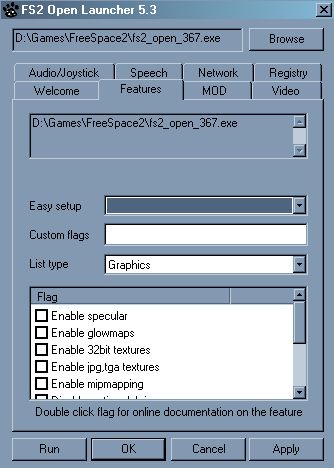 Features setupThis tab is where most of FS2_Open's options can be toggled on and off. At the top is a readout of your current command line. You should include this if you ever need to report an error wtih FS2_Open."Easy setup" basically allows you to turn lots of features on or off at once. Generally most people use it and then fine tune the settings immediately afterwards. "Custom flags" allows you to add any command line flags that don't show up in the Launcher. This may be because they require additional arguments, as is the case with the "-fov" command line argument (for more information, you can see the Command Line Flags page of the wiki). For now though we'll just leave this bit blank. Mod SettingsNow you might be thinking you haven't got any mods installed so you don't need to fiddle with this. You'd be wrong however. We installed the media VPs in such a way that FS2 will treat them as a mod. So click on Select Mod and choose the mediavps folder that you picked earlier.The reason that we installed the media VPs as a mod is that if FS2_Open doesn't work you can click the no MOD button and run without them and check whether the problem is with the build or the media VPs. It also means that you can still run retail FS2 if you want to. Now you're done. Click run and have fun playing on FS2_Open. |