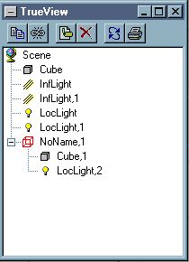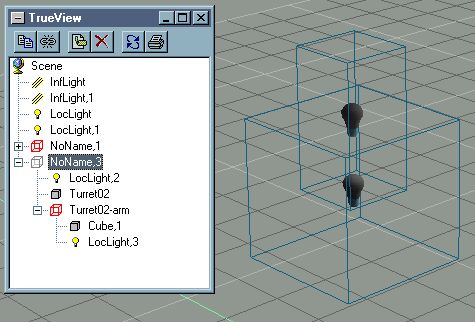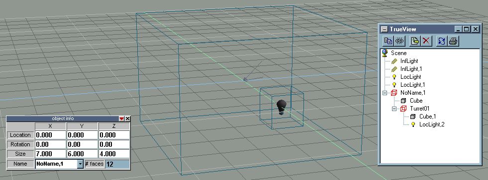 You then pick up the newly created light in TrueView and drag it on top of the turret object (it will probably be called Cube,1 but if you don't have that simply select the turret in the main window and see what gets selected in TrueView). A new group called Noname,1 has been created. If you click on the plus sign to open it up and have a look you'll see that it contains the turret object you created and the light. The picture in TrueView will then look like the one on the right. Rename the whole group Turret01 and rename the light Turret01-fp_01. What you then do is position the turret in the correct position in relation to your ship. I've stuck it on the front. You then drag and drop the turret on top of it. You should end up with a scene that looks like the one below.