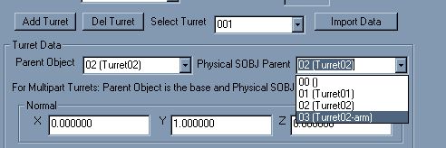 In the select turret box select Turret001 (You'll only have two choices anyway). PCS uses zeroth ordering so this is in fact turret02 (Whenever selecting a turret simply subtract 1 from the number you gave it in True space to find the number PCS gave it). Once you've selected the turret you'll notice that both the parent object and the physical SOBJ object are both set to Turret02. This is incorrect. Set the physical SOBJ object to Turret02-arm