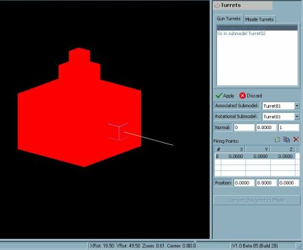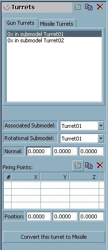 Again in this case both the Associated submodel and the Rotational Submodel are the same. This time however this is wrong. Turret02 is multi part turret and therefore the Rotational Submodel should be the Turret barrel NOT the turret base. Change it to Turret02-arm. The rest of the turretting process is pretty much the same as before. Add the firing point. Change the normal (this time change Y not Z to 1) and then alter the firing point to put it on the top of the barrel. (NB When dealing with multipart turrets the Normal must always be 1 or -1 or the turret won't work properly in the game.