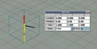 Click on the cube button. Right click on the object tool button (it's the one that looks like a mouse pointer arrow) and change the numbers for the location to 0,0,0. If you're using TS3.2 two of those will already be zero but the third (Z) will be 1. Just to make things more interesting you might want to texture it but if you don't know how to do that it won't matter. Your screen should look something like the picture below now. (I'm using TS6.0 so it will look slightly different.)