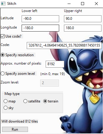 Note that Google may temporarily block your IP if you download too many tiles. To combat this use a VPN to switch proxy server on being blocked, then on restarting Stitch, the tiles already downloaded do not need to be downloaded again (provided the generated tiles/ directory is not deleted). This way extremely large maps can be generated.