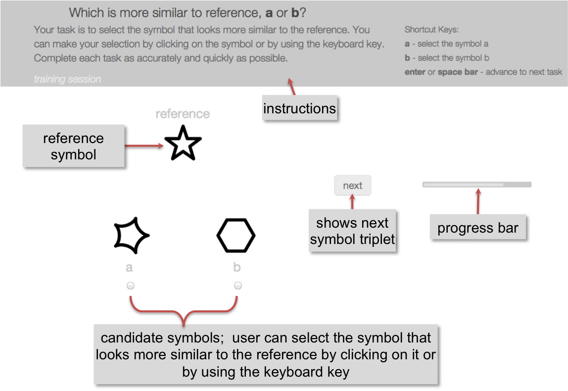 Your task is to select the symbol that looks more similar to the reference. You can make your selection by clicking on the symbol or by using the keyboard key. Complete each task as accurately and quickly as possible.