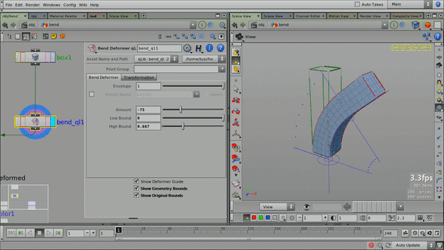 Bending -- guide geometry shows bend settings; the original (green) and deformed (red) geometry bounding boxes are also displayed.
