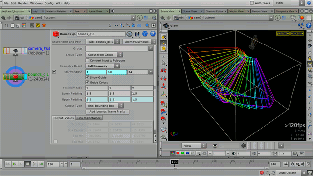This operator can evaluate its input geometry over a frame range, merge it into a single geometry, and compute the resulting bounding box. The results are also returned as numeric parameter values (so they can be referred to in expressions, etc).